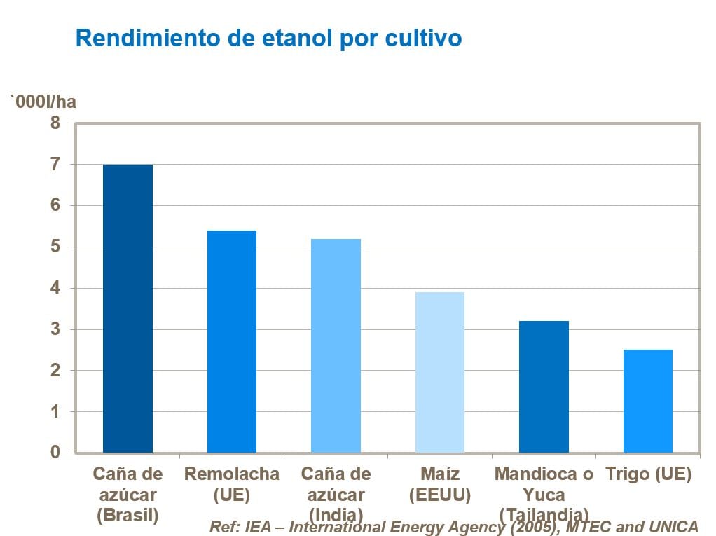 La caña de azúcar es considerada como una de las fuentes más eficientes de biomasa para biocombustibles. El rendimiento de etanol por unidad de superficie de caña de azúcar es al menos el doble que el producido por el trigo o el maíz.