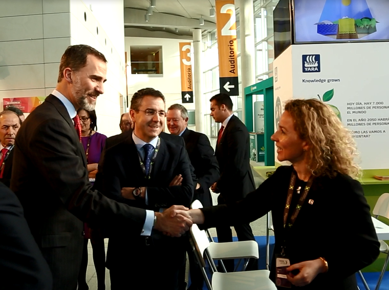 El Rey Felipe VI mostró su interés por las soluciones innovadoras que ofrece Yara y que permiten que la agricultura sostenible a florezca en España. Su majestad conversó con Mónica Andrés sobre el liderazgo de Yara en la nutrición por cultivos y se sorprendió al descubrir que Yara lleva más de 100 años suministrando fertilizantes a los agricultores españoles.