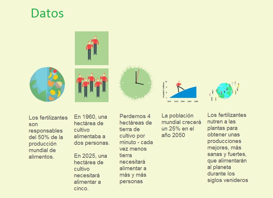 Perdemos alrededor de 4 hectáreas de tierras de cultivo por minuto. Si en 1960 una hectárea de cultivo alimentaba a dos personas, en 2025 se prevé que esa misma hectárea necesite alimentar a cinco. Una vez más, los fertilizantes son la vía más apropiada para hacer frente a estos enunciados, siempre desde una posición que ayude a preservar la biodiversidad y hacer frente al cambio climático.