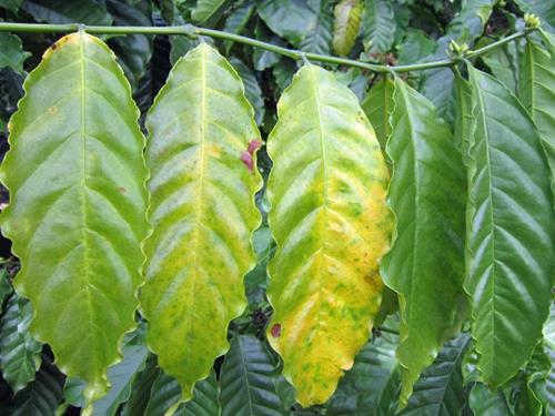 Las deficiencias de N normalmente se presentan en las hojas más viejas. Sin embargo, en el cafeto aparecen primero en las partes más expuestas al sol. Las clorosis por deficiencias de N y S son muy similares. Cuando la deficiencia es de N la superficie de la hoja se ve opaca, mientras que cuando la deficiencia es de S, la superficie permanece brillosa.