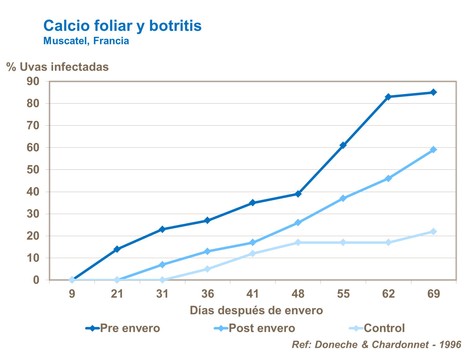 Juega un papel tan importante en la lignificación y maduración de la madera de la vid que tolera mejor las heladas y enfermedades. Las aplicaciones foliares de calcio antes o después del envero reducen la incidencia de botrytis.