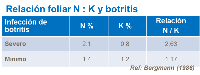 Mantener una correcta la relación entre potasio/nitrógeno podrá ayudar a minimizar los efectos de botrytis y también ayuda a reducir las infecciones virales. Cuando en esta relación favorece al nitrógeno, el resultado es un incremento en el crecimiento vegetativo resultando tejidos menos resistentes a las infecciones.